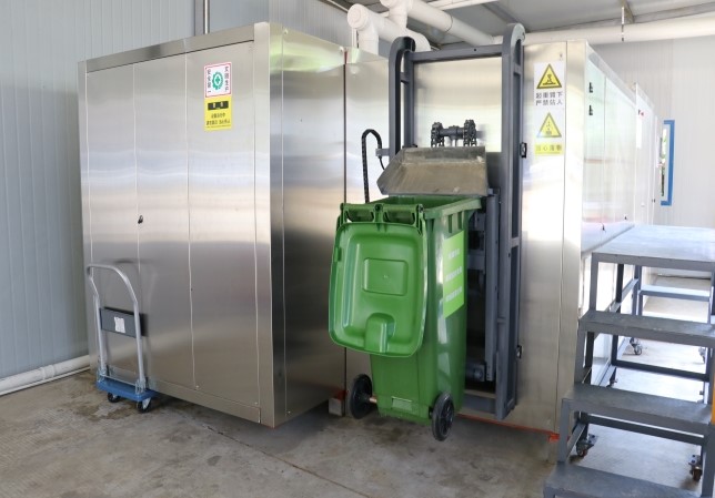 果蔬垃圾首先通过设备提升装置进行提升、称重,并倒料至分拣平台,由工作人员分拣出果蔬垃圾中的塑料袋等杂物;