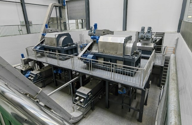 卸料斗内的物料会通过无轴螺旋输送机输送至破碎机进行初次破碎处理,再通过生物物质破碎分离机分离出纸皮、塑料袋、可乐瓶等无机质物料,分离出的无机质物料通过直升电梯直接外运处理。