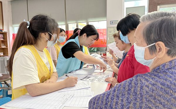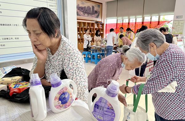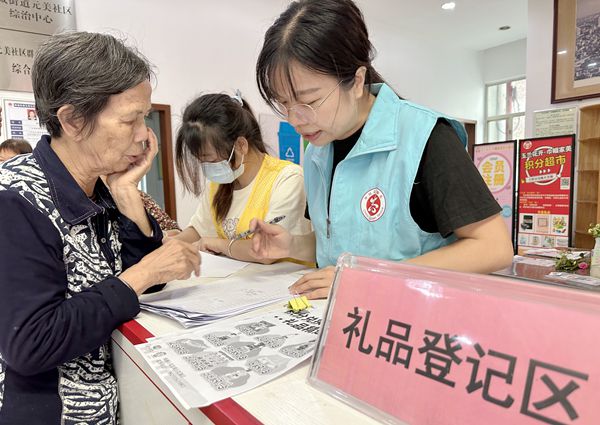 活动现场设置了礼品登记区、礼品领取区与花束制作区。在礼品登记区,现场工作人员耐心地给居民们讲解兑换规则,并根据积分数量让居民挑选自己喜欢的礼品进行兑换,这些礼品包括日常生活用品,如洗衣液、沐浴露、牙膏、抽纸、保鲜膜、垃圾袋、洗手液等,工作人员登记完居民要兑换的礼品后,居民便可凭兑换券前往礼品领取区,工作人员会根据兑换券为居民发放相应的礼品。